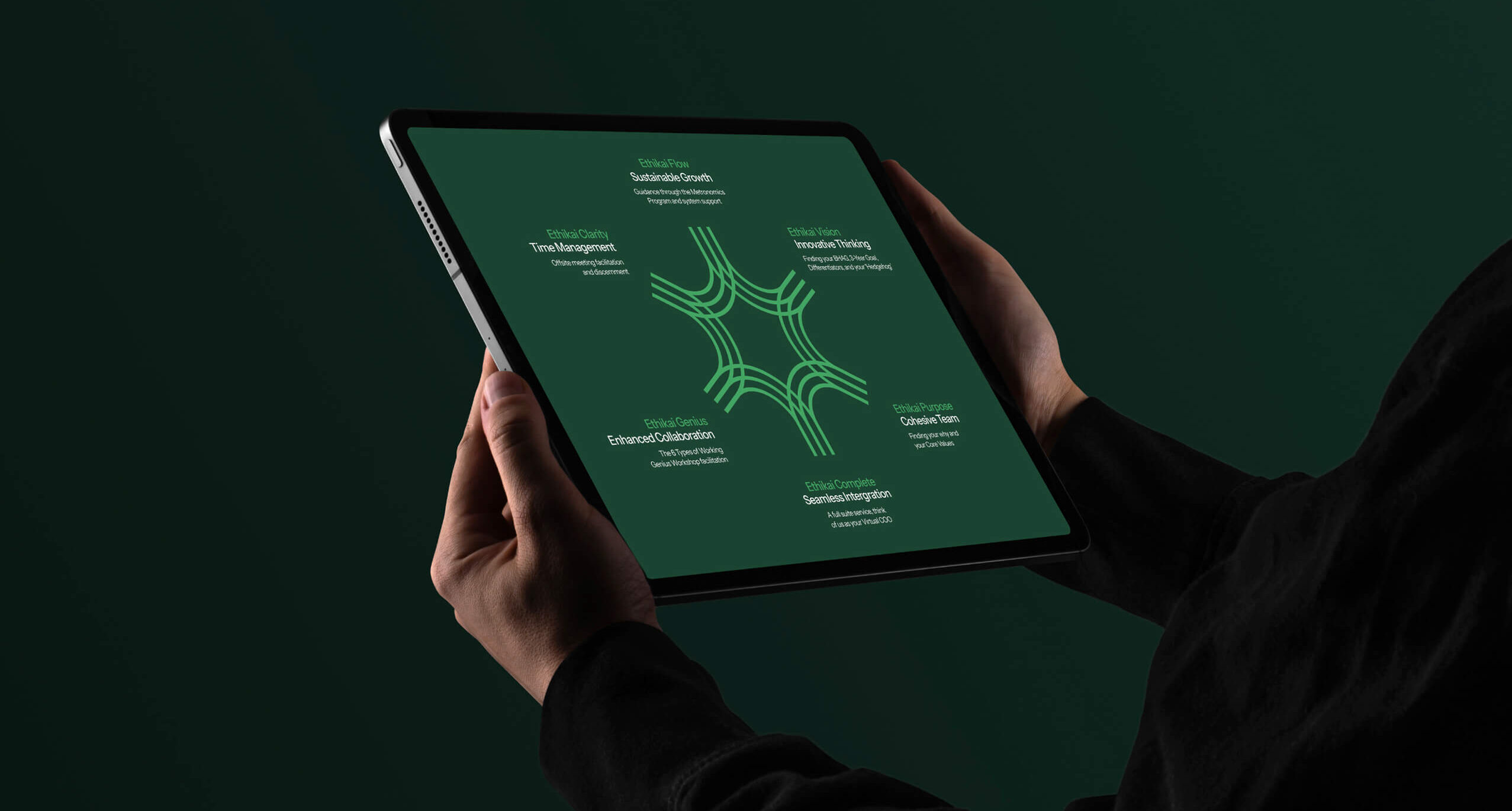 The refreshed visual identity includes a refined logo, colour palette and visual elements that signal focus, alignment and forward momentum. These assets provide Ethikai with a coherent presence across digital touchpoints and client-facing materials.
