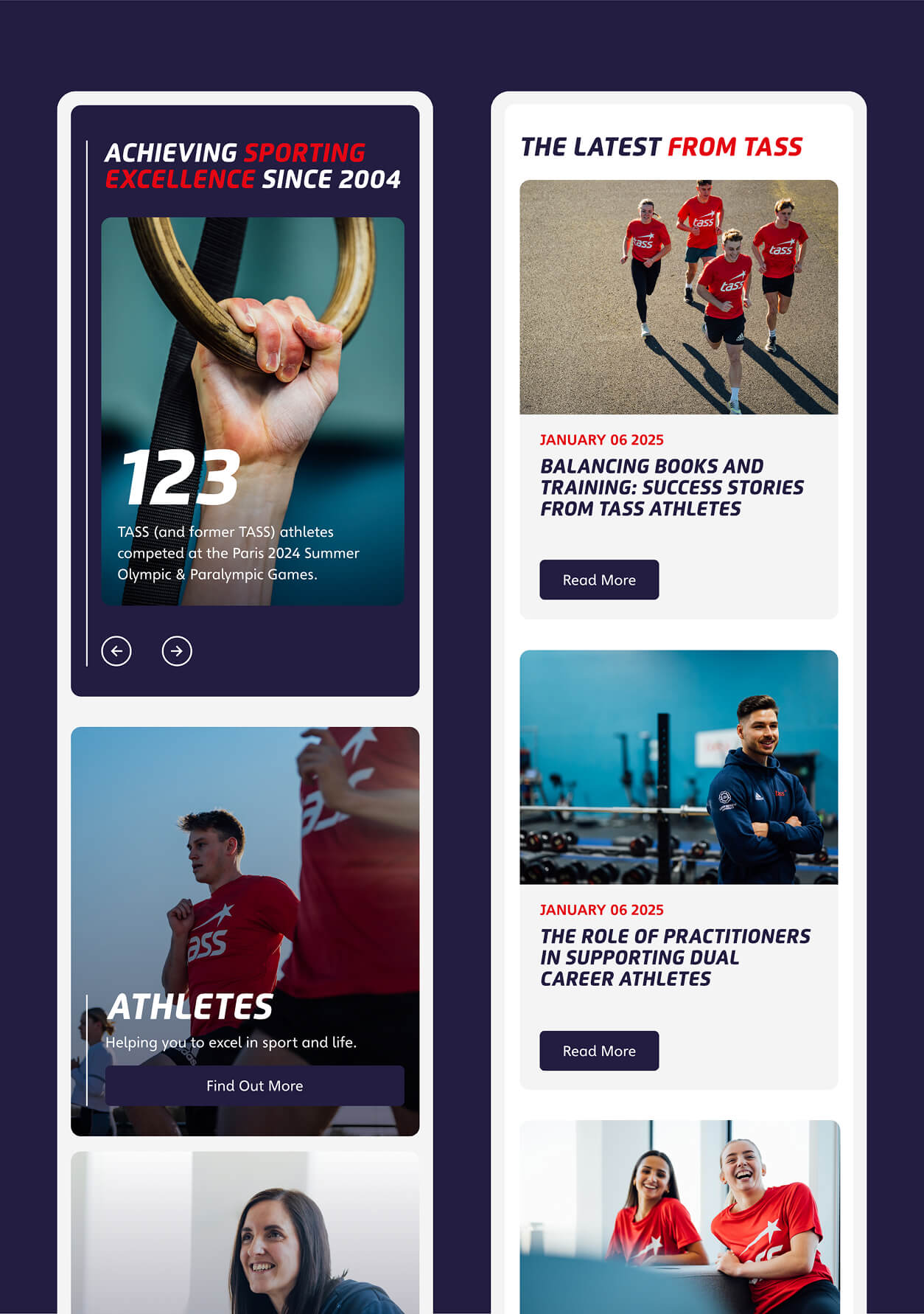 TASS brings together a multidisciplinary team of practitioners to support athletes holistically. Their digital presence needed to mirror that approach: inclusive, clear and genuinely useful for everyone who interacts with the programme.